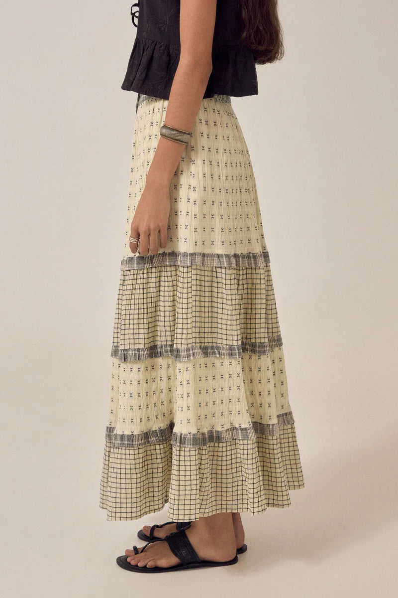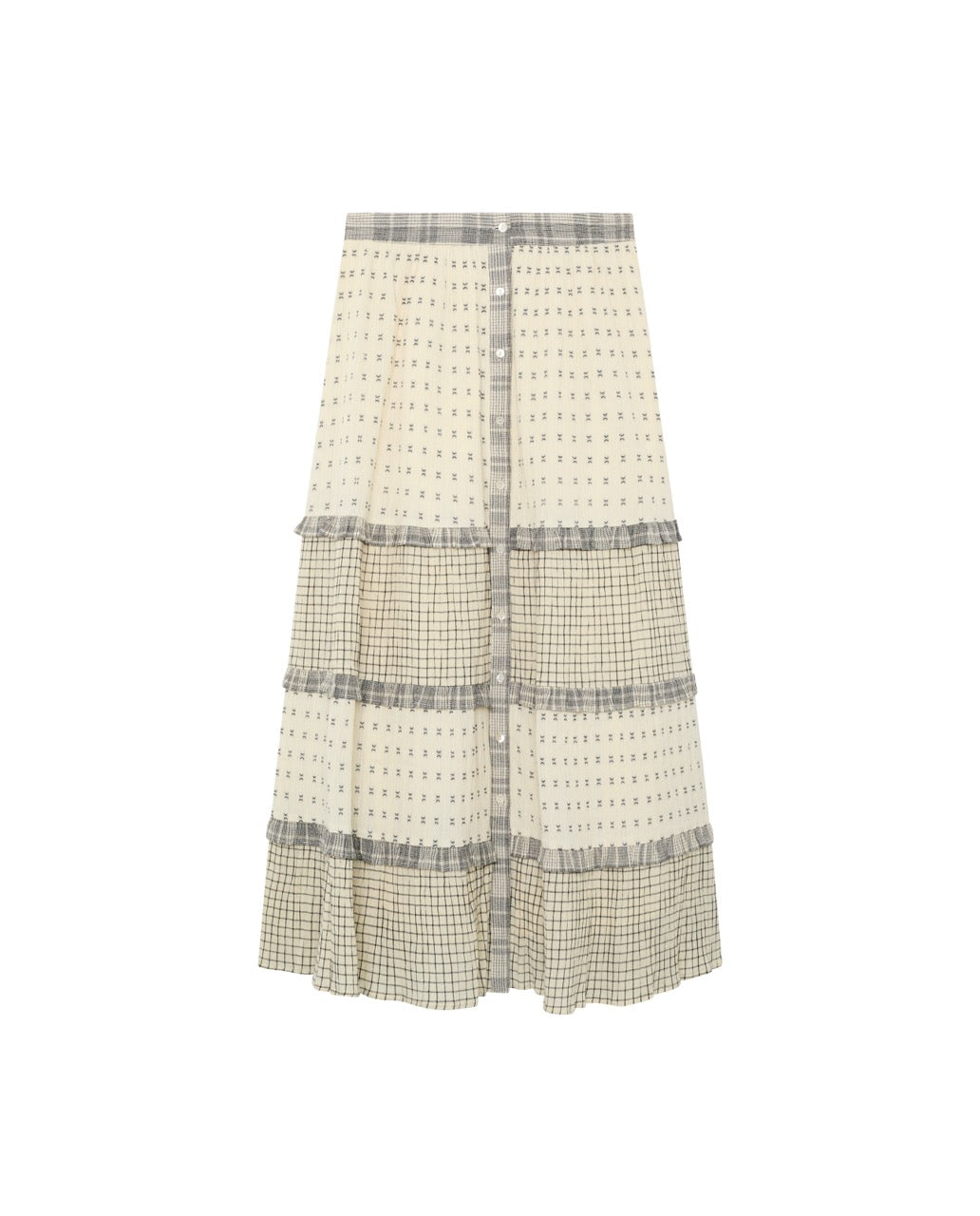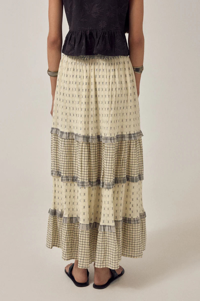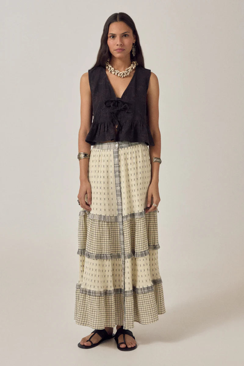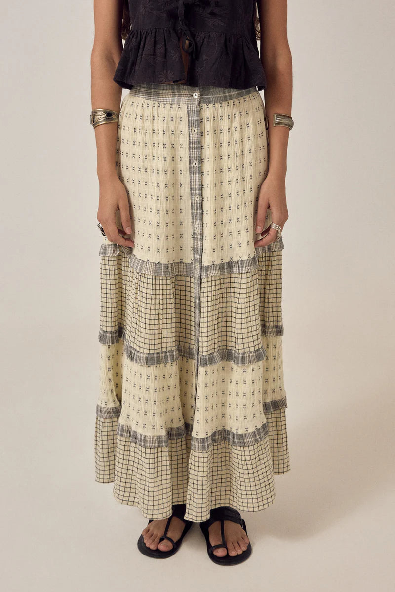 Long tiered skirt in soft cotton patchwork. Elasticated waistband at the back, button-down front running center length. Fluid, easy sway with each tier. Moves gently, never precious.