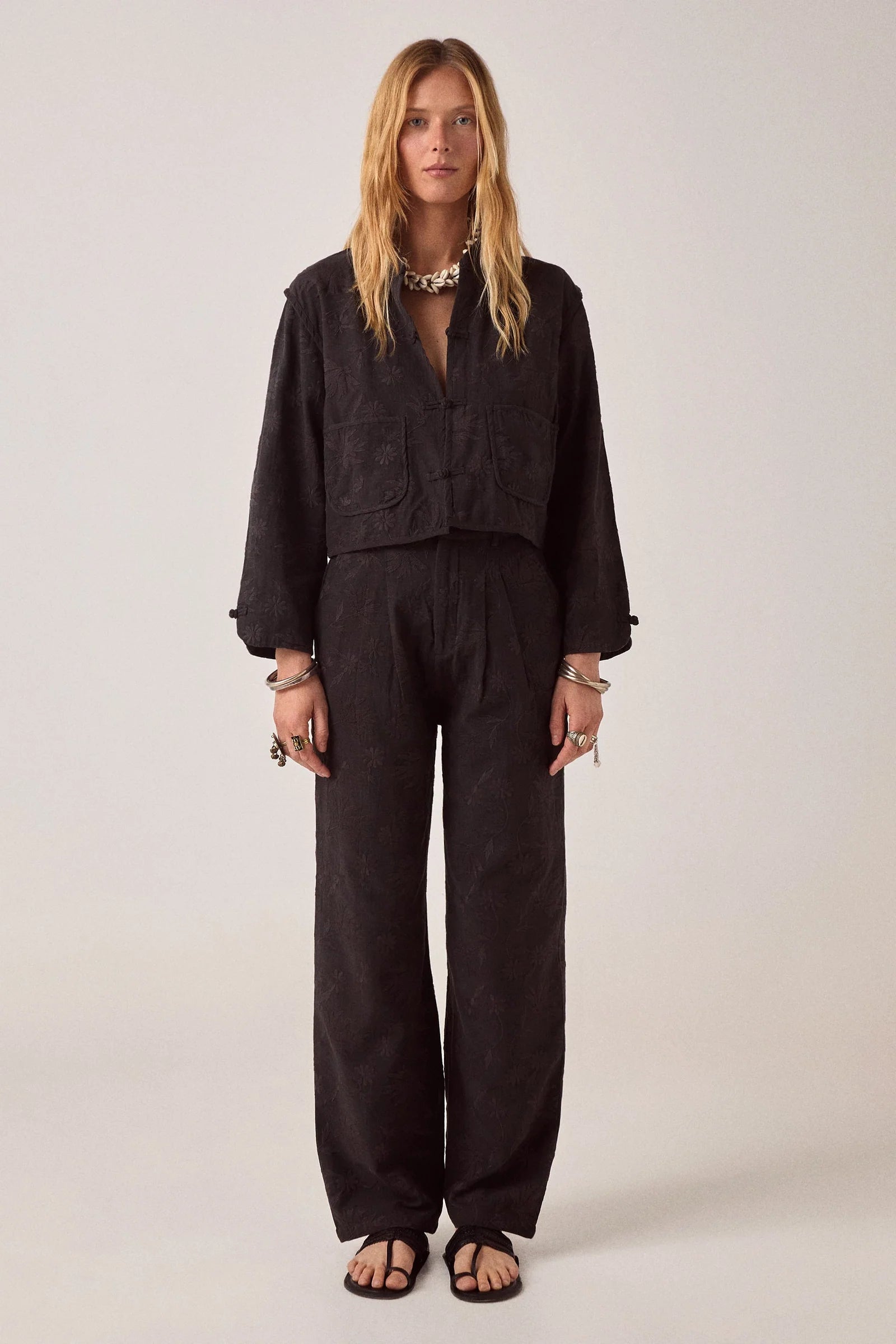 The embroidery is subtle—tone-on-tone black so it reads as texture. Viscose slub has weight without being heavy, holds the wide leg without collapsing. The pleats add structure at the waist.