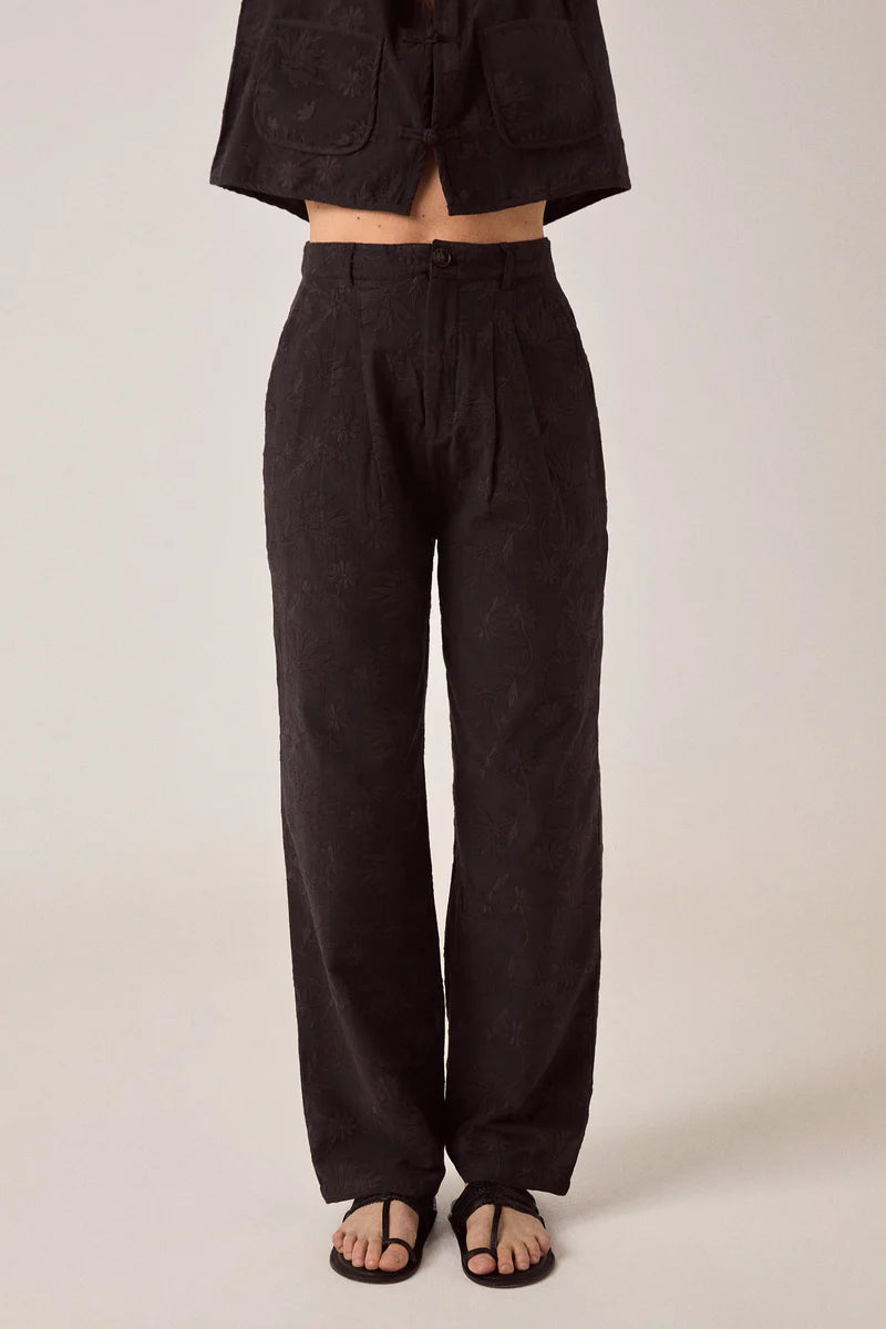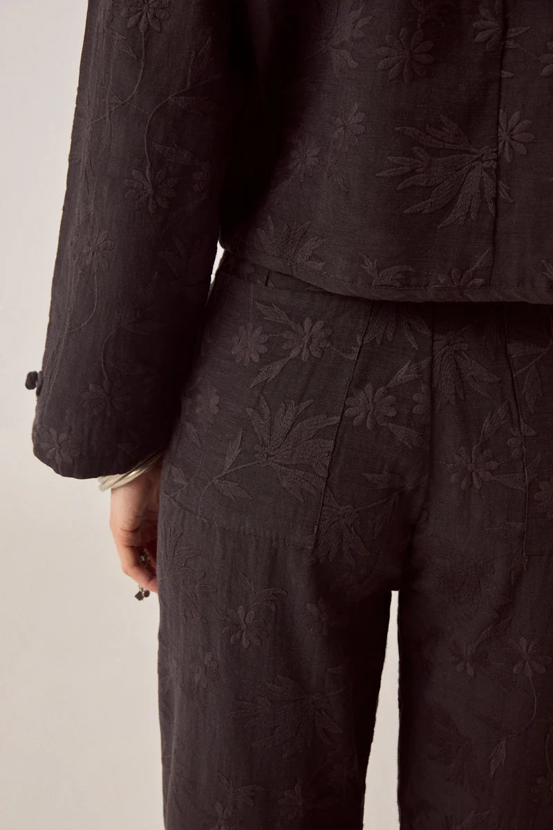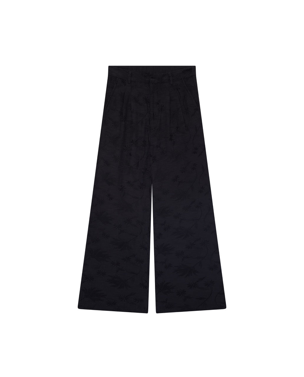 Wide-leg trouser in viscose slub with tonal embroidery. Deep black base with black embroidered leaves and flowers. High-waisted with pleats at the front. Button and zip closure, two back pockets. Full length with a wide, straight leg.