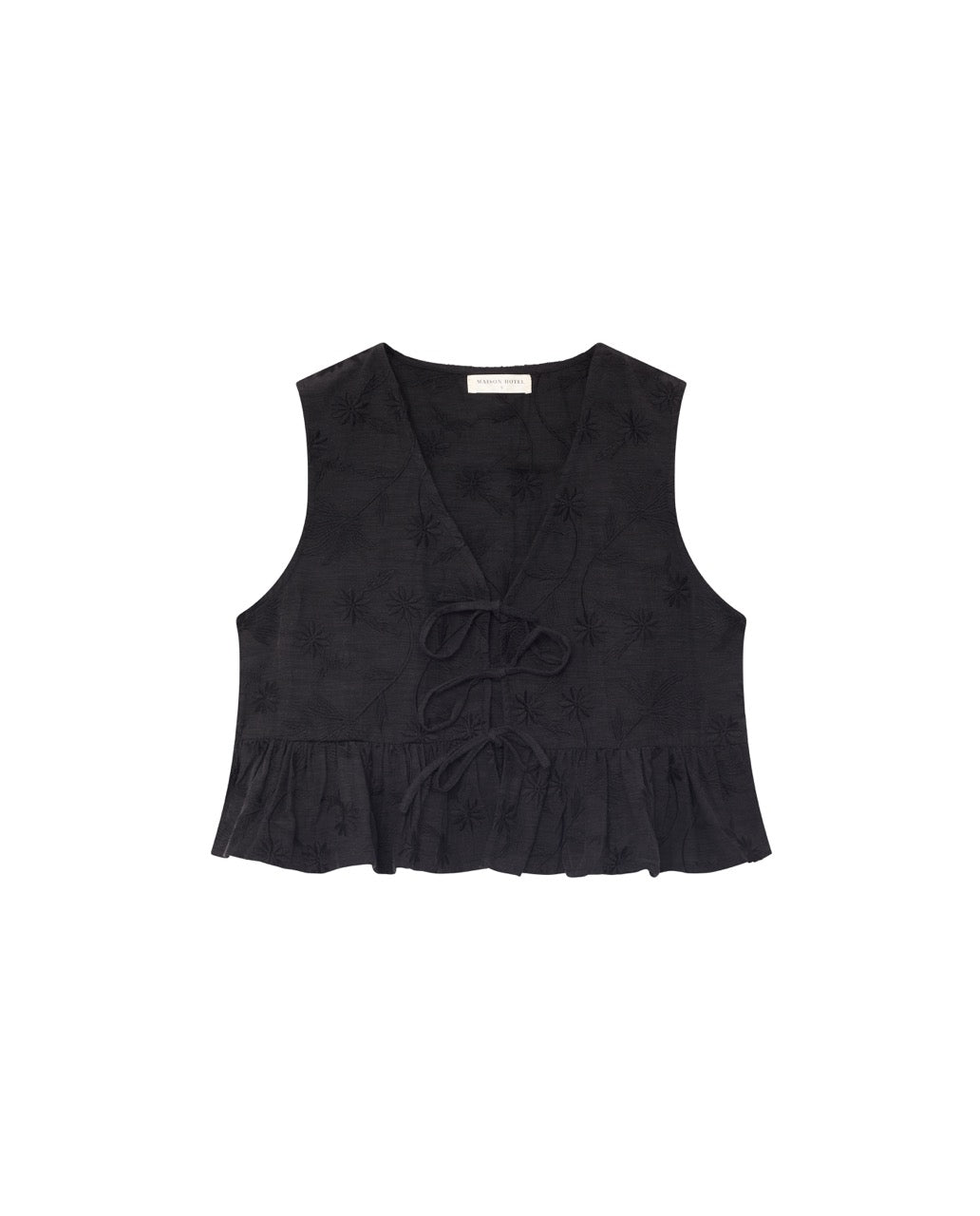 Sleeveless top in viscose slub with tonal embroidery. Deep black base with black embroidered leaves and flowers. V-neckline, side ties that knot at the front, ruffle peplum hem. Cropped length. Fitted through the body with a flared peplum.